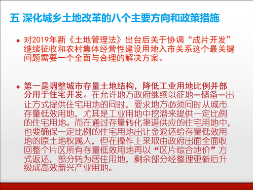 最后,陶然教授提出了深化城乡土地改革的八个主要方向和政策措施。一是调整城市存量土地结构,降低工业用地比例并部分用于住宅开发。二是适度调整城市增量土地的获取方式与供地结构。三是总结现有发达地区“留用地安置”的经验并大胆创新,逐步推动农地征收中的“留用物业安置”。四是中央应考虑在“圈外”以试点方式适度放开对集体经营性建设用地只能用于工业、商业的用途管制。五是中央应考虑在自愿基础上推动我国农村土地的渐进国有化改革。六是建立起一个包括“跨区增减挂钩和折抵指标调剂”、“易地补充耕地实现占补平衡”和“基本农田易地代保”为基本内容的三类土地发展权转移和跨区市场化交易。七是地方政府通过规划将低效用地部分转化为住宅用地并和业主分享部分住宅用地出让金。八是设定更合理的博弈规则破解城市更新困局。