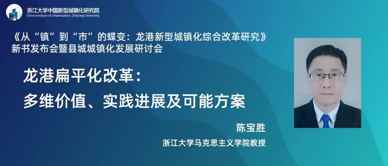 2022年8月17日,由浙江大学中国新型城镇化研究院举办的《从“镇”到“市”的蝶变:龙港新型城镇化综合改革研究》新书发布会暨“县城城镇化发展研讨会”在杭州市成功举办。会上,浙江大学浙江大学马克思主义学院陈宝胜教授以“龙港扁平化改革:多维价值、实践进展及可能方案”为题作专题报告。
